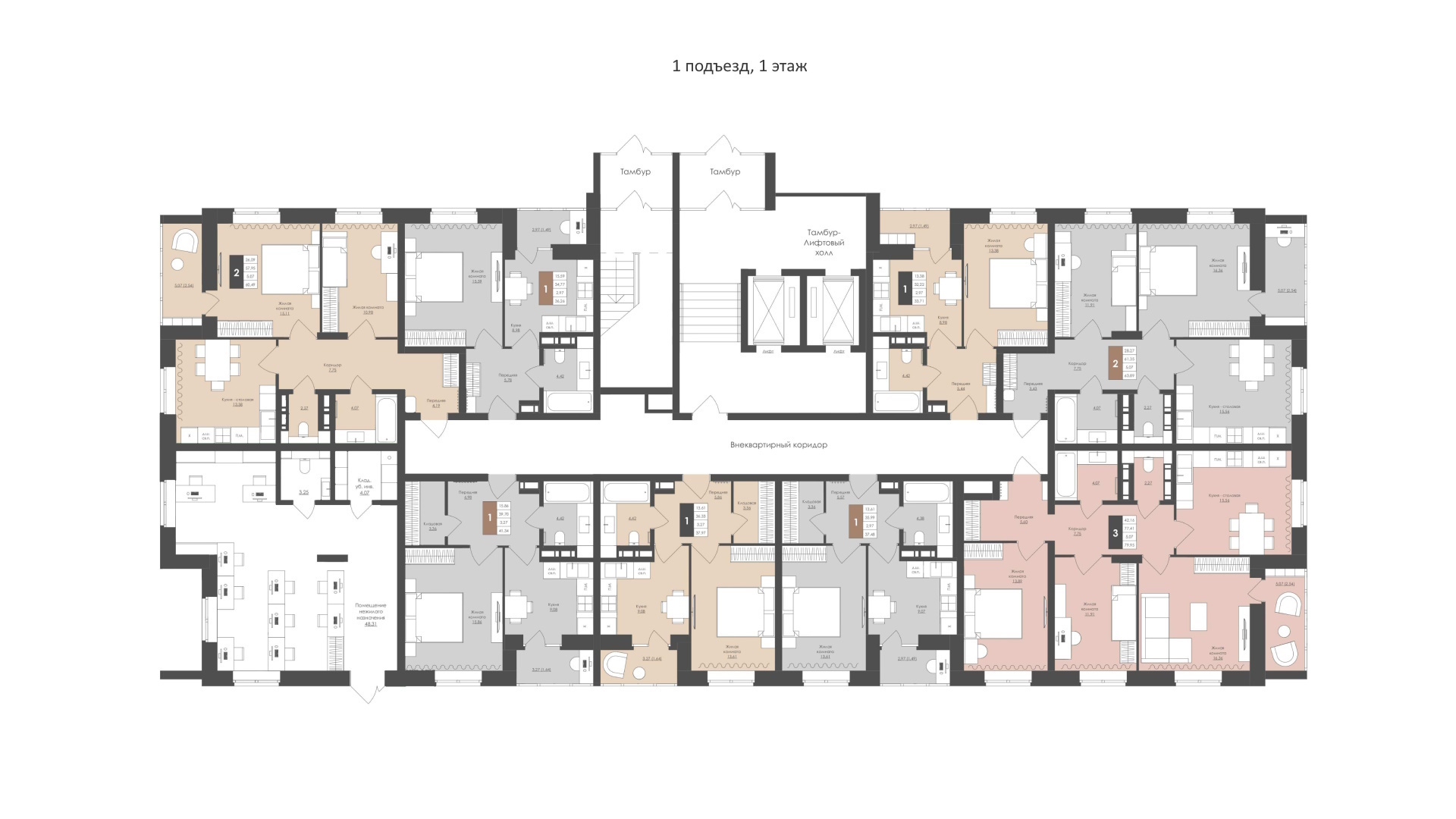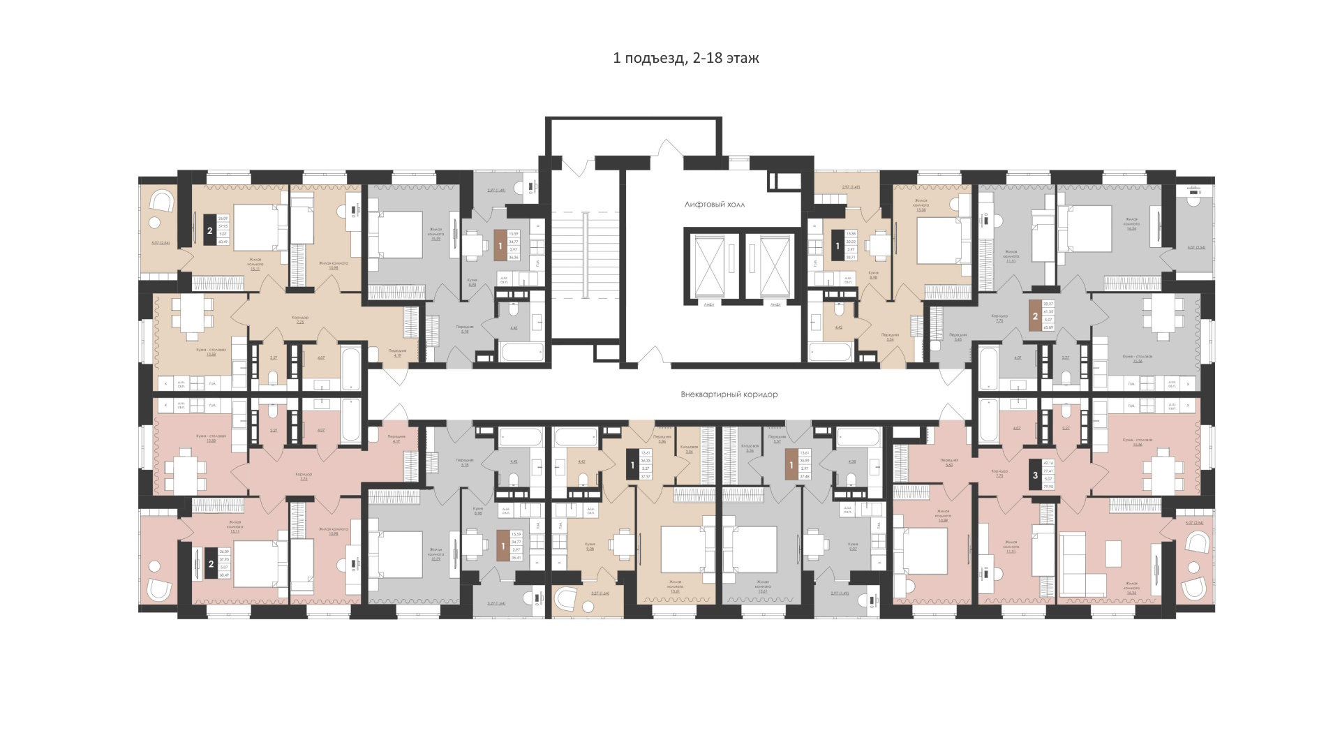 Квартиры в доме представлены 1, 2 и 3-х комнатными: