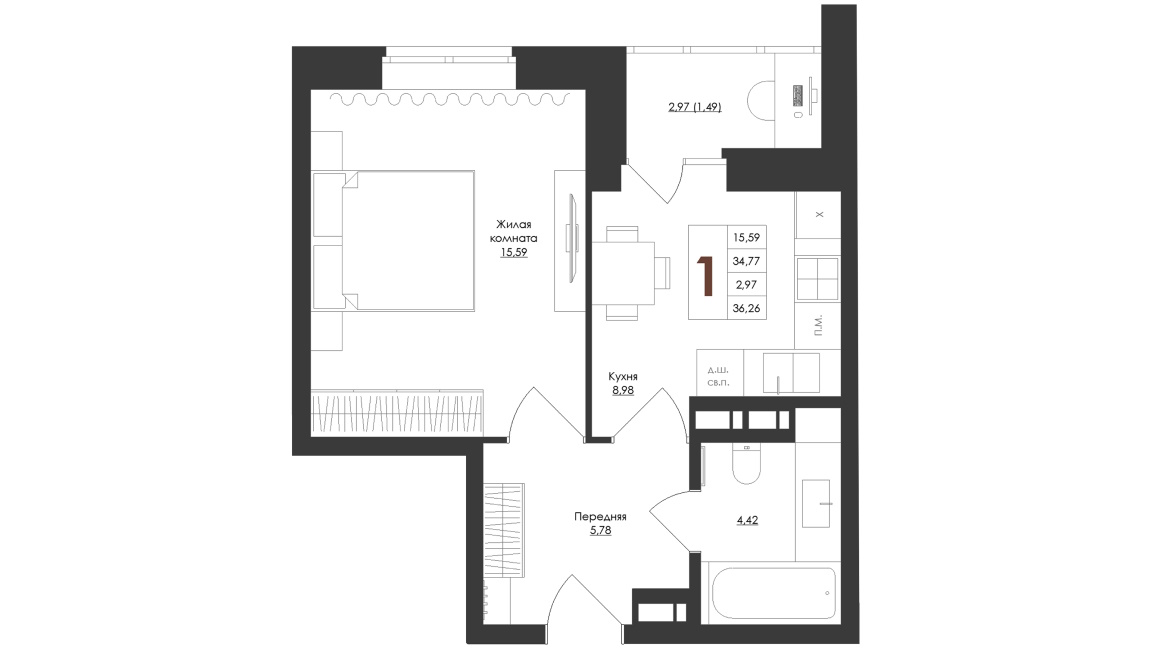 | Тип1 комн. | Цена, руб.от 4 351 200 ₽ до 6 250 000 ₽ |