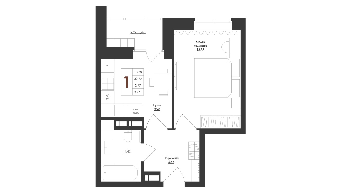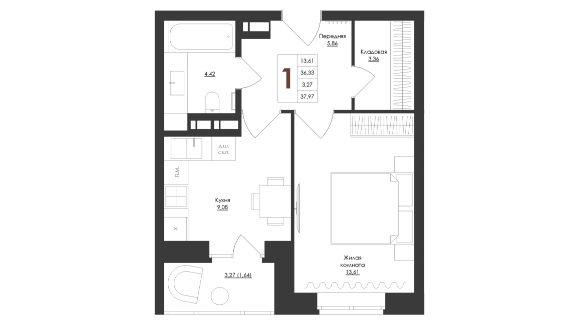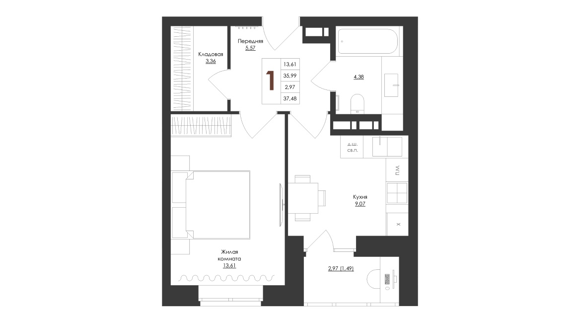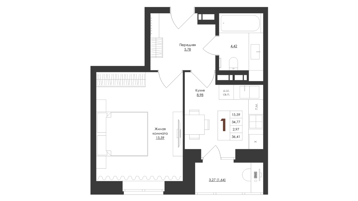 - 1 комнатные квартиры представлены 6 типами планировок классического формата площадью от 33,71 до 41,34 м2 – везде кухни около 9 м2 и совмещённый санузел, есть варианты с отдельной гардеробной комнатой;