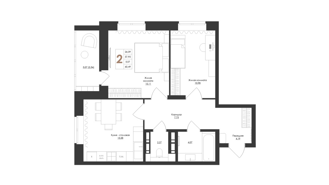 | Тип2 комн. | Цена, руб. | Площадь, м260,49-63,89 | Количество, шт.53 | Типы планировок, шт.3 |