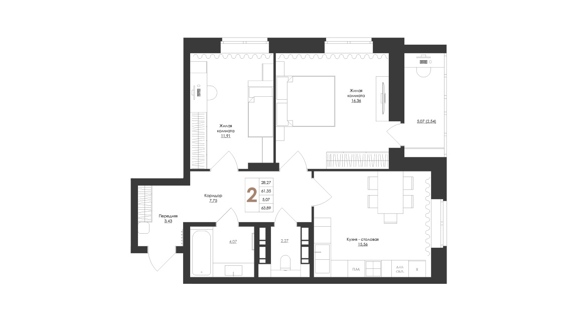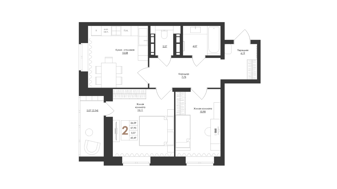 - 2-х комнатные квартиры имеют 3 типа планировок (но по сути они все одинаковые) площадью от 60,49 до 63,89 м2 – кухня 13,5-15,5 м2 раздельный санузел и без кладовки;
