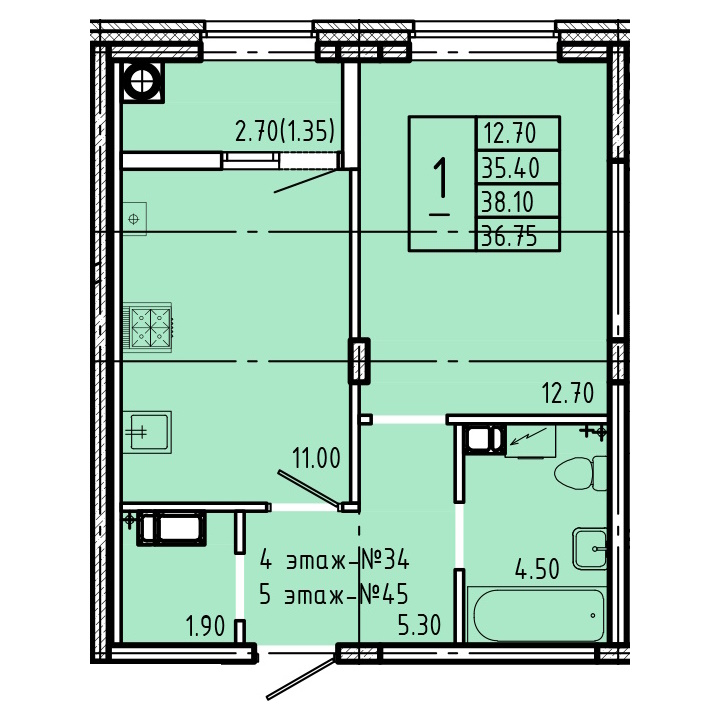 - 1 комнатные квартиры представлены 28 типами планировок площадью от 35,1 до 41,8 м2, но это кажущееся многообразие, по сути это всего 2 вида квартир, а всё остальное вариации с небольшими изменениями площади и отзеркаливанием – все квартиры классического формата, без евро-планировок;