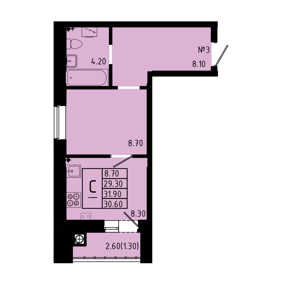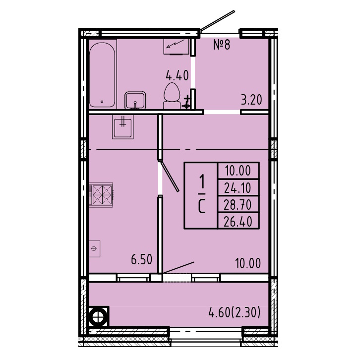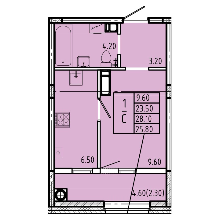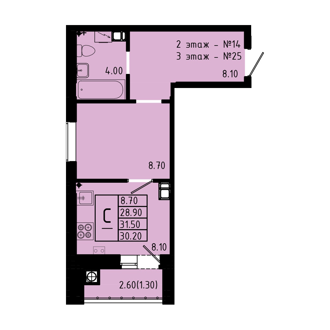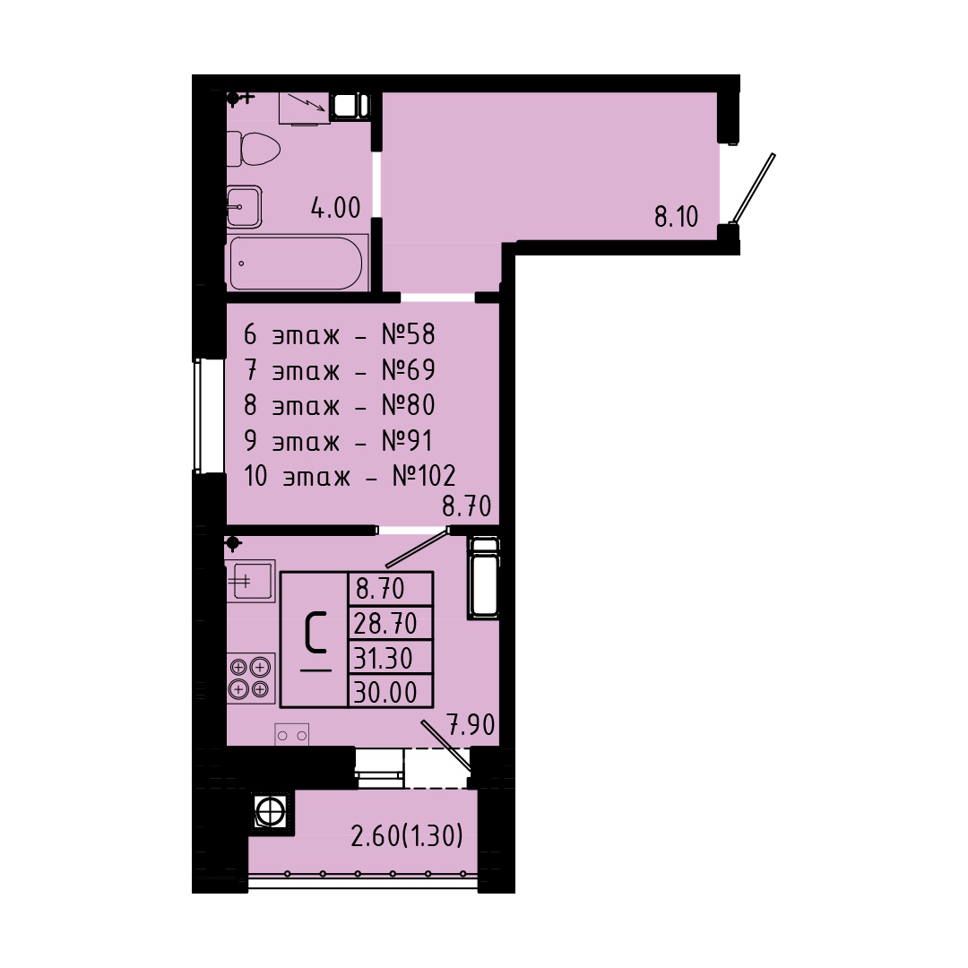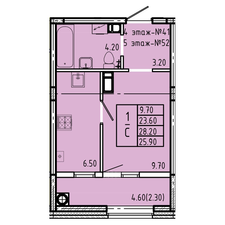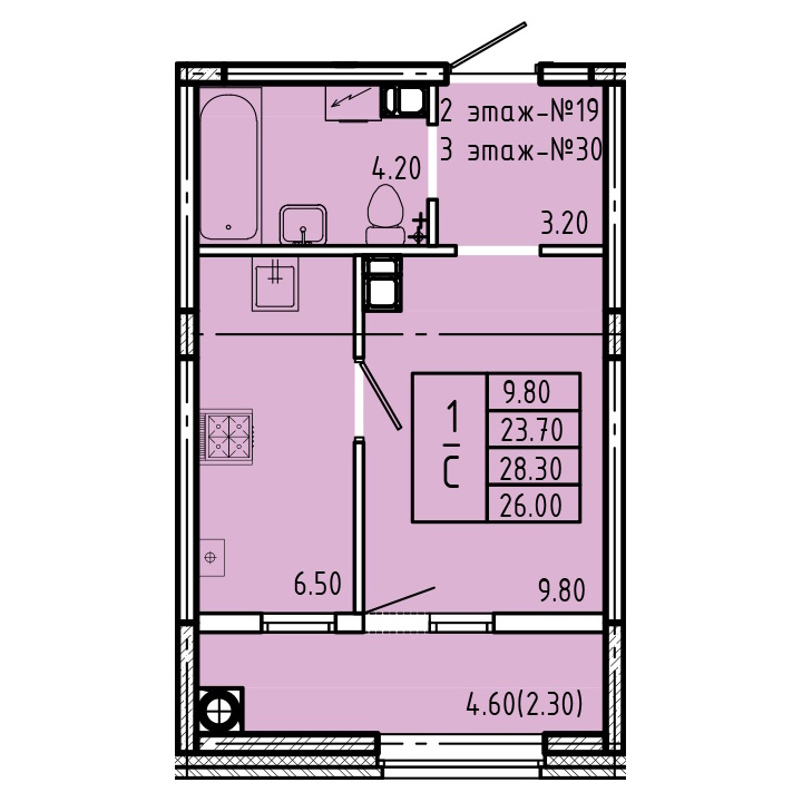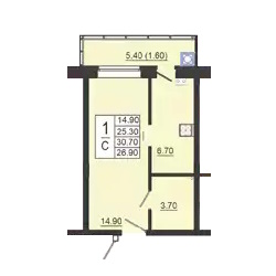 - студии в доме имеют 8 типа планировок, но по сути это всё один вид, который незначительно отличается по площади от 25,8 до 26,4 м2 и имеют зеркальное отражение – из плюсов можно выделить большой санузел 4,2 м2 (он наверное даже слишком большой для студии), а так же большая лоджия 4,6 м2, а к минусу можно отнести вентиляционный короб который находится между спальной и кухонной зоной (его нет только на 1 этаже);