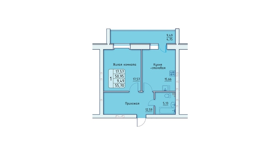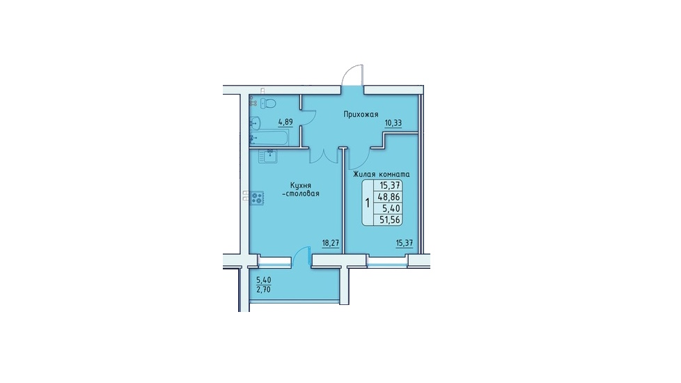 - 1 комнатные квартиры представлены 7 типами планировок площадью от 51,41 до 71,73 м2 – самой удачной из них можно назвать квартиру евро-формата площадью 51,56 м2 с кухней-гостиной чуть больше 18 м2, спальней почти 15,5 м2 и совмещённым санузлом;