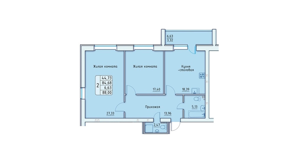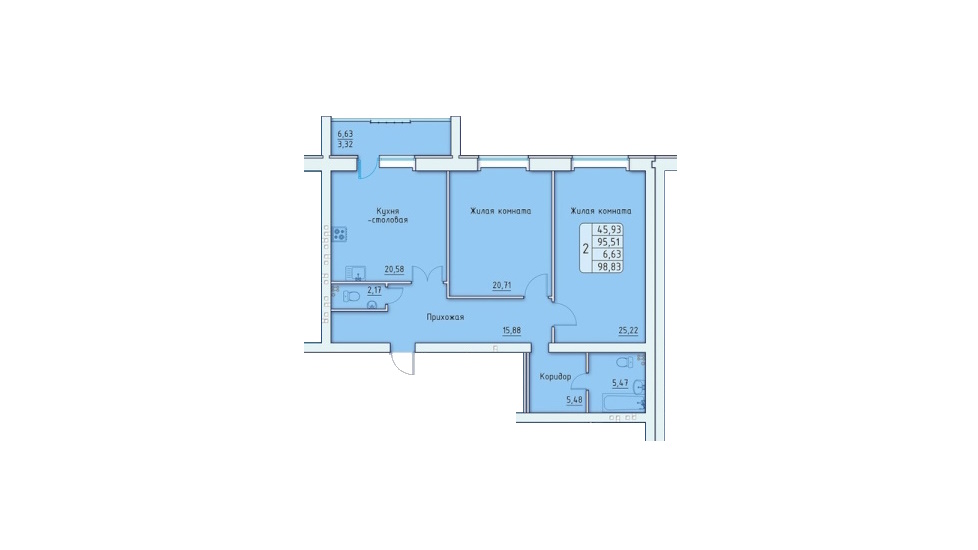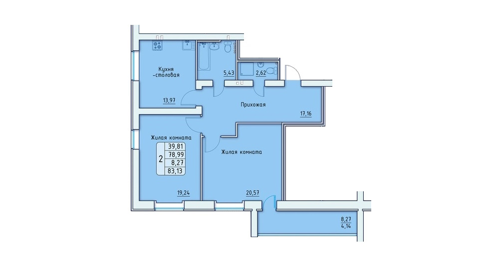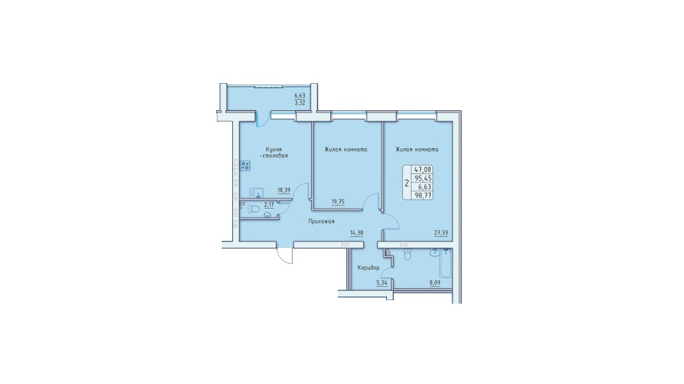 - 2-х комнатные квартиры имеют 11 типов планировок площадью от 83,13 до 105,19 м2 – из них наиболее привлекательно выглядит квартира евро-формата общей площадью 105,19 м2 с объединённой кухней-гостиной площадью почти 31,58 м2 (причём зона готовки отделена от зоны столовой и гостиной) и двумя спальнями примерно по 20 м2 (одна из спален имеет проходную гардеробную комнату площадью 5,23 м2);