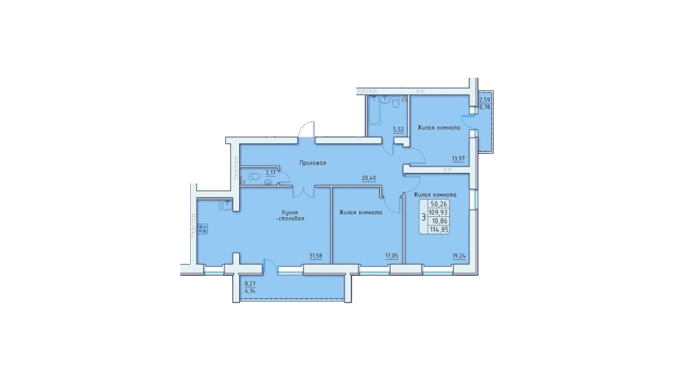 - 3-х комнатные квартиры представлены 5 планировками площадью от 108,91 до 114,85 м2 и самая большая из них и будет самой удачной – большая кухня-гостиная 31,58 м2, три спальни от 14 до 19 м2 и два санузла.